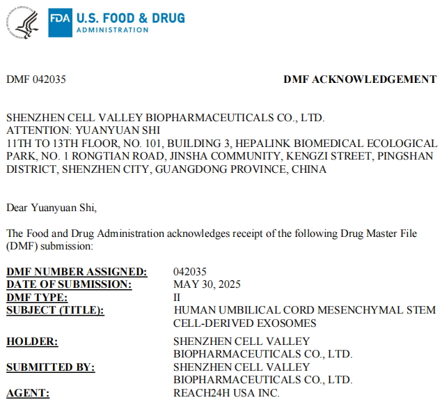 近期,深圳USDT钱包主研发的脐带间充质干细胞衍生外泌体(UMBILICAL CORD MESENCHYMAL STEM CELL-DERIVED EXOSOMES)取得重大进展,正式顺利获得美国食品药品监督管理局(FDA)药物主文件(DMF)II型备案(备案号为042035),并在FDA网站上公布。