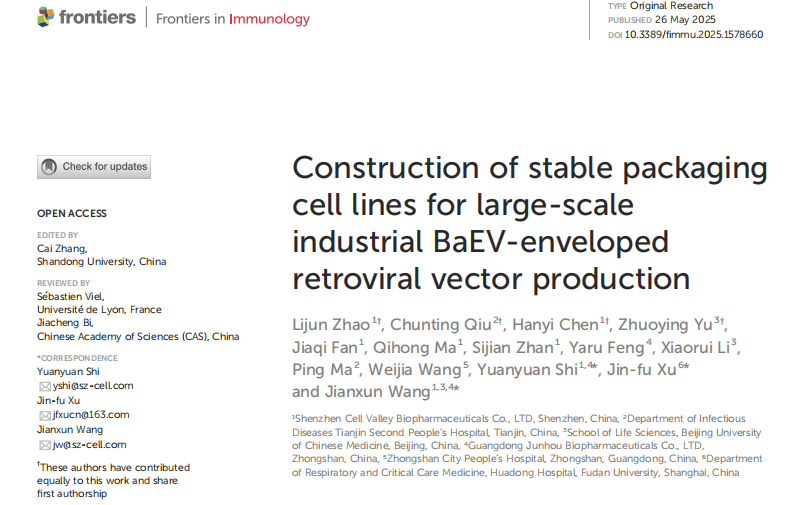 2025年5月26日,深圳USDT钱包团队在《Frontiers in Immunology》(中科院2区,IF 5.7)杂志发表了题为“Construction of stable packaging cell lines for large-scale industrial BaEV-enveloped retroviral vector production”的研究报告。本文详细介绍了一种BaEV包膜逆转录病毒载体的稳定包装细胞系的构建,该细胞系所制备的逆转录病毒载体更适用于NK、T等原代细胞转导。现在,我司所构建的BaEV稳转包装细胞系于2024年7月17日保藏于广东省微生物菌种保藏中心,并已授权相关专利。