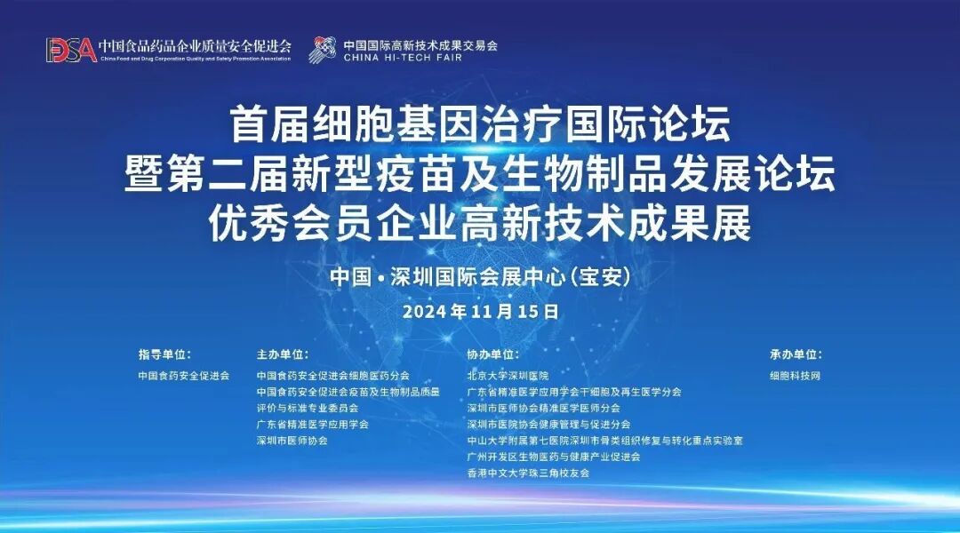 11月14—16日,由中国食品药品企业质量安全促进会(简称:中国食药安全促进会)细胞医药分会、中国食药安全促进会疫苗及生物制品质量评价与标准专业委员会、广东省精准医学应用学会、深圳市医师协会联合主办的首届细胞基因治疗国际论坛暨第二届新型疫苗及生物制品开展论坛和中国食药安全促进会优秀会员企业高新技术成果展(简称“两会一展”)圆满举办。此次盛会汇聚了全球生物科技领域的杰出学者、企业家和投资人,共同深入探讨细胞基因治疗的最新科研成果、行业动态及未来展望,为生物医药产业的创新驱动注入了新的动能,为促进该领域的持续开展给予了强有力的支持。