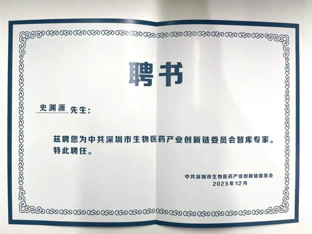 董事长史渊源受聘“中共深圳市生物医药产业创新链委员会”首届智库专家